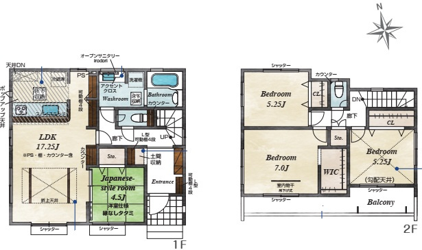 LDKは可動棚、キッチンのカウンターはスパイスラック付き。洗面化粧台はフルフラットカウンター付きで前面壁はアクセントクロス。玄関は土間収納スペース、2階7帖洋室はWIC有り。床下収納2箇所(キッチン、洗面所)