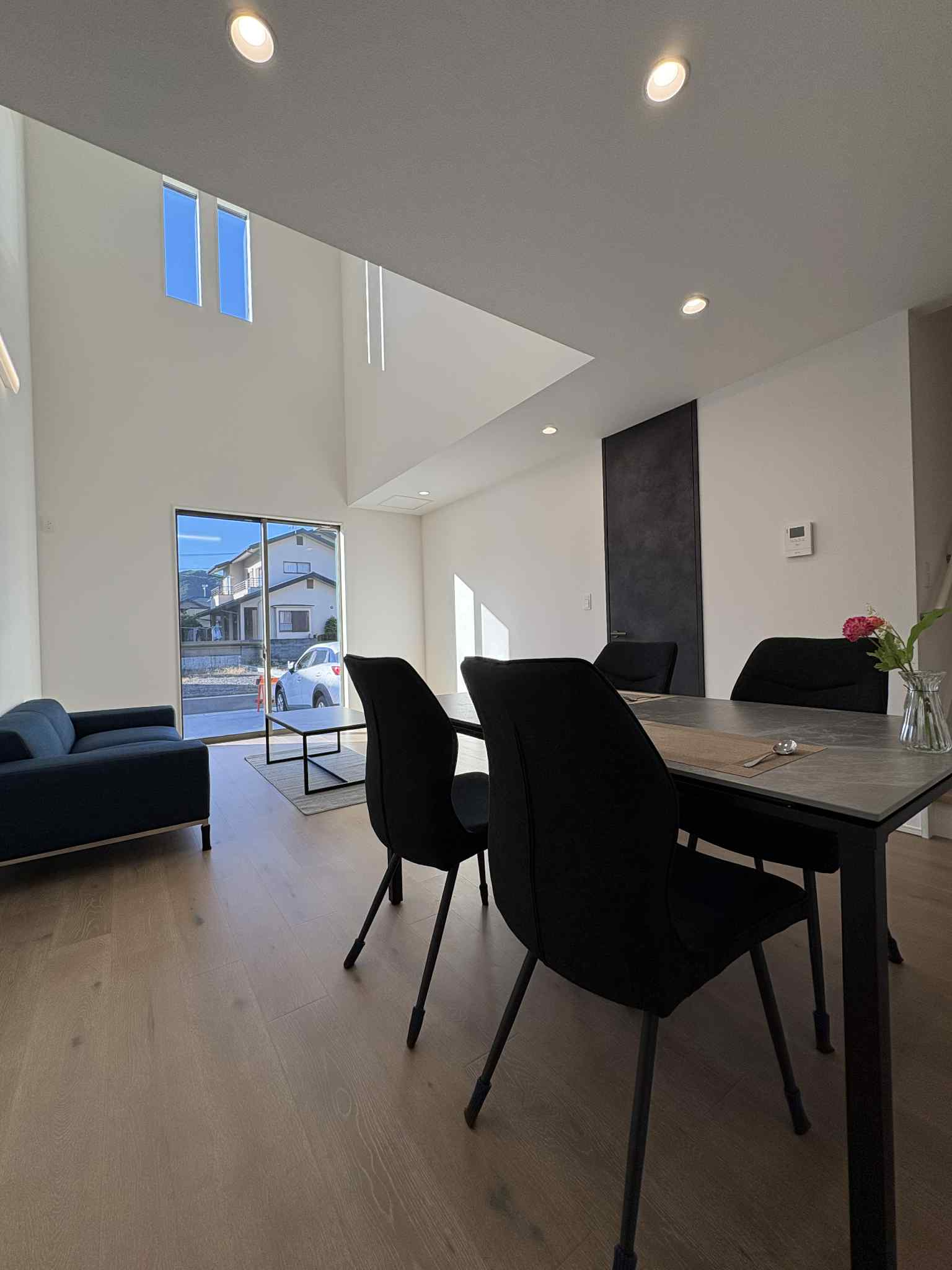 黒を基調にしたカッコイイ外観や、吹き抜けをとおして光がはいるリビング、